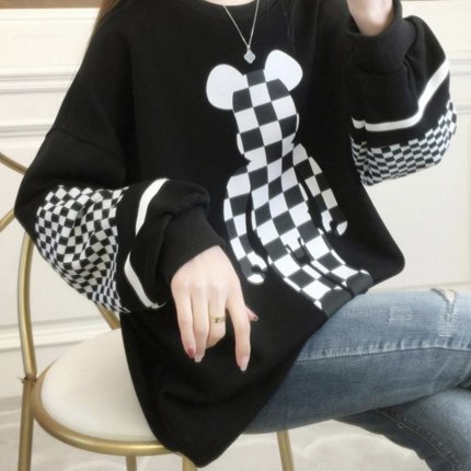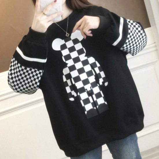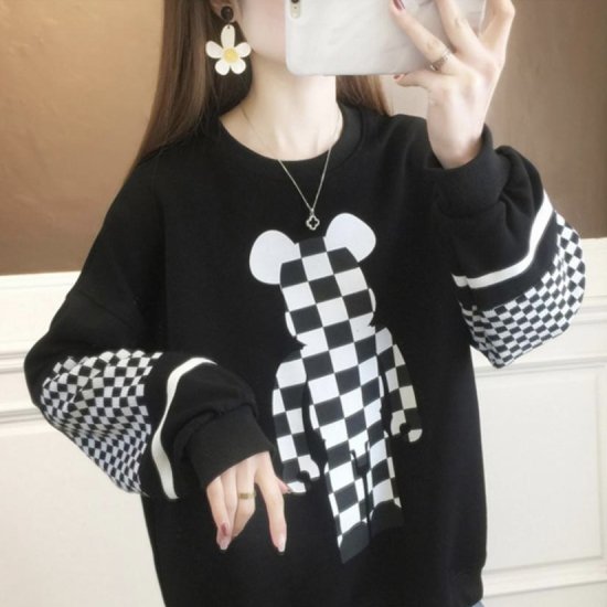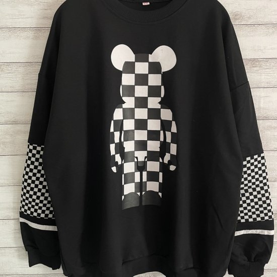 韓国 レディース チェッカーフラッグ ベア くま トレーナー 黒